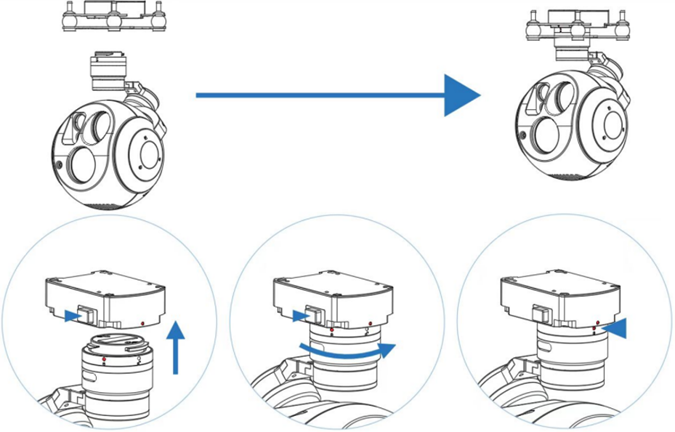 如下图,请务必确保断电插拔云台,并检查确认锁扣锁死。