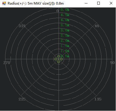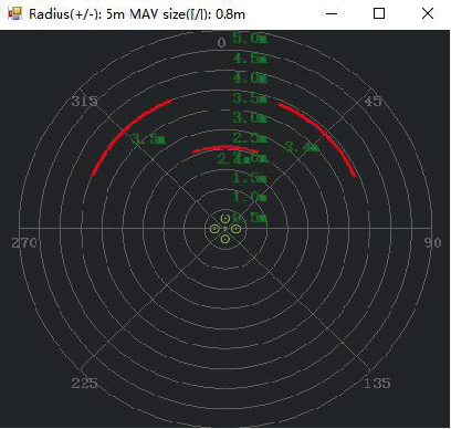 图中315°到45°这个区间中,会显示红线,每根红线代表一个目标障碍物,一个区间中最多显示三个目标。