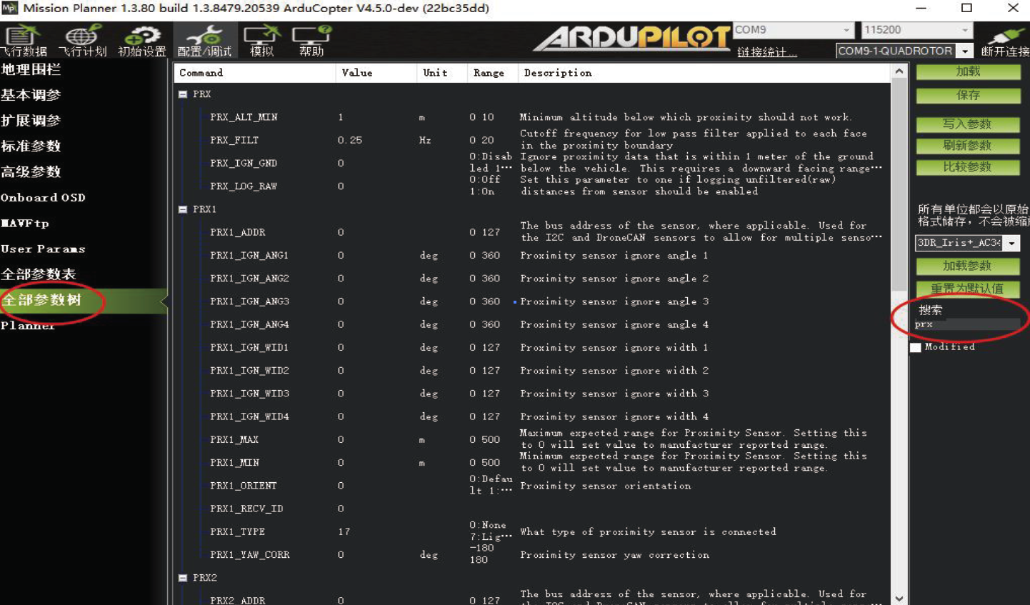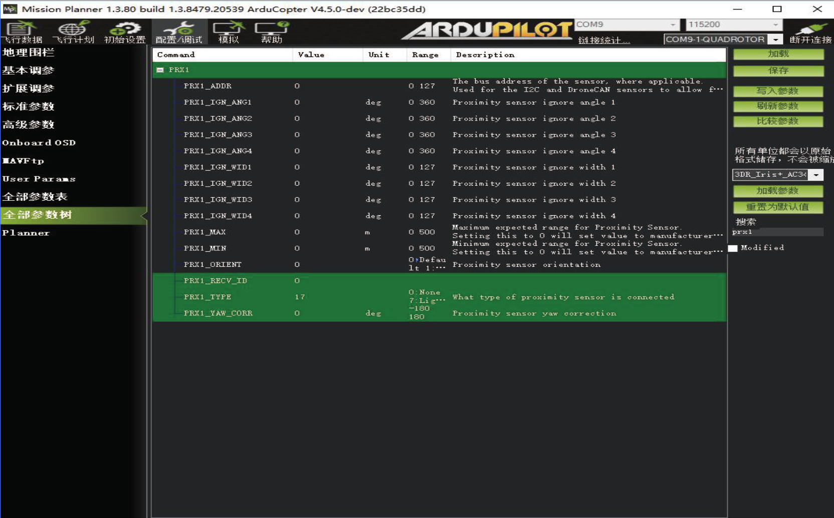 注:在默认参数中配置PRX参数时,您需要先将PRX1_TYPE设置完,写入参数并刷新参数,才能对后续参数进行配置。在修改PRX_RECV_ID时,需要重启一次飞控,才会显示这个参数的修改。