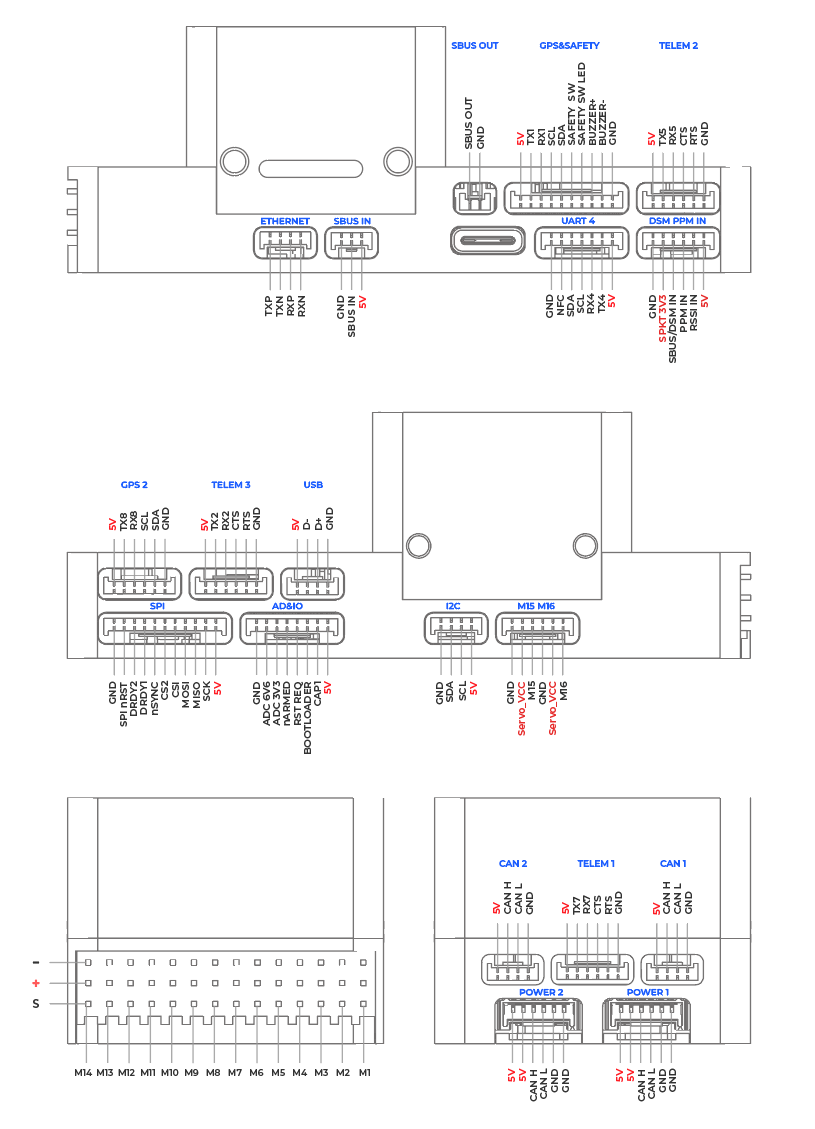 | M1-M16 | M1-M16:支持PWM输出,可连接PWM电调或舵机、连接相机快门/热靴等 其中M15-M16通过配备的线缆进行扩展 M1-M14支持Dshot协议 M9-M14支持双向Dshot |