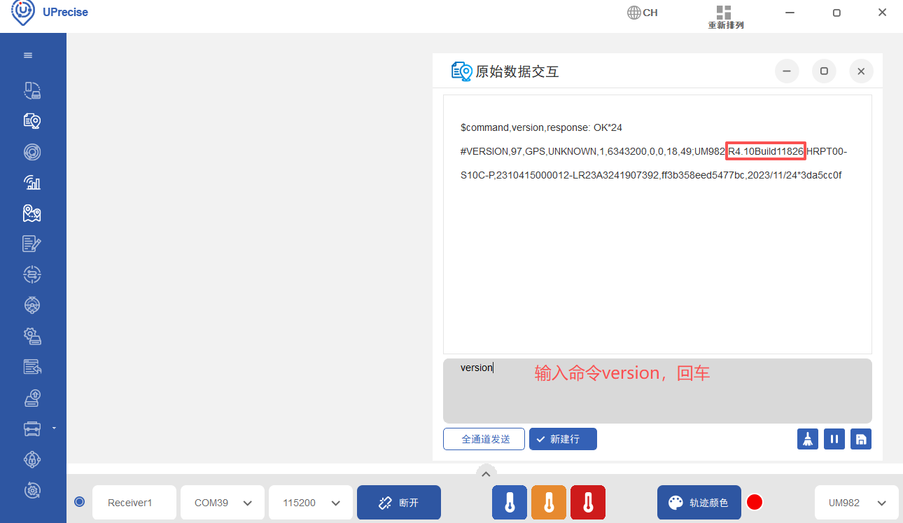 检查固件版本是否正确,在原始数据交互里输入命令version,键盘回车,将显示出固件版本信息,正确版本号是Build11826,若不对则进行以下更新步骤