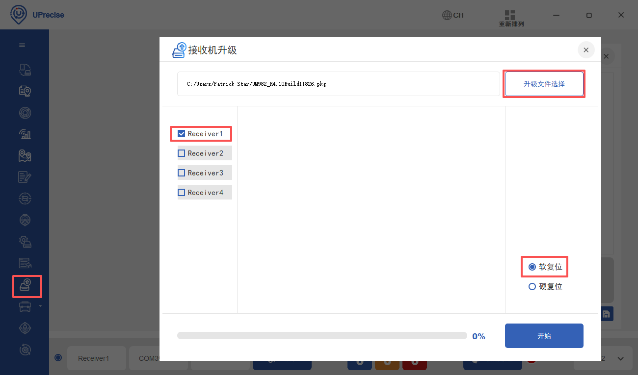 点固件升级的图标,勾选receiver 1和软复位,点升级软件选择