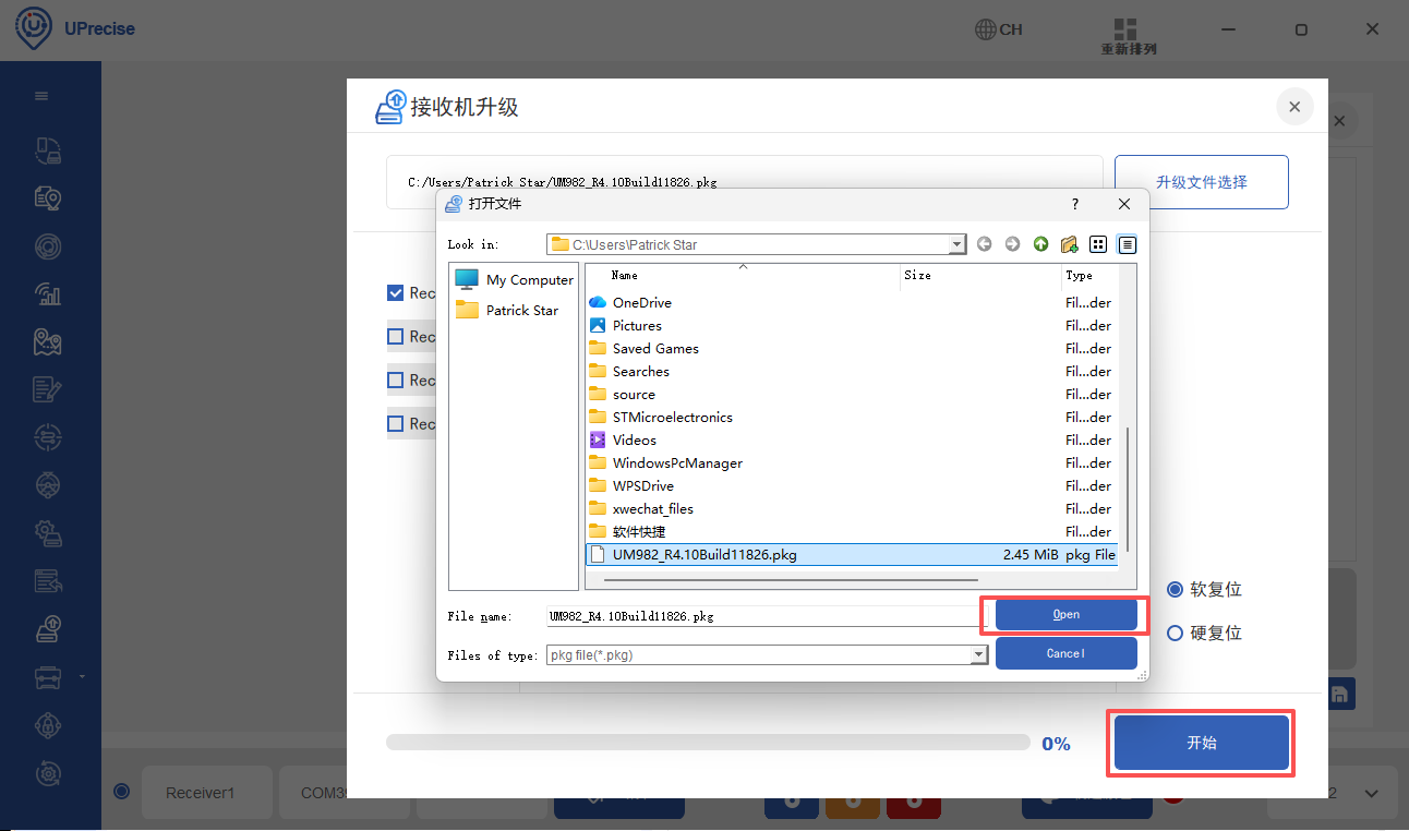 选择固件文件,点打开,点开始,等进度条到100%则完成升级。