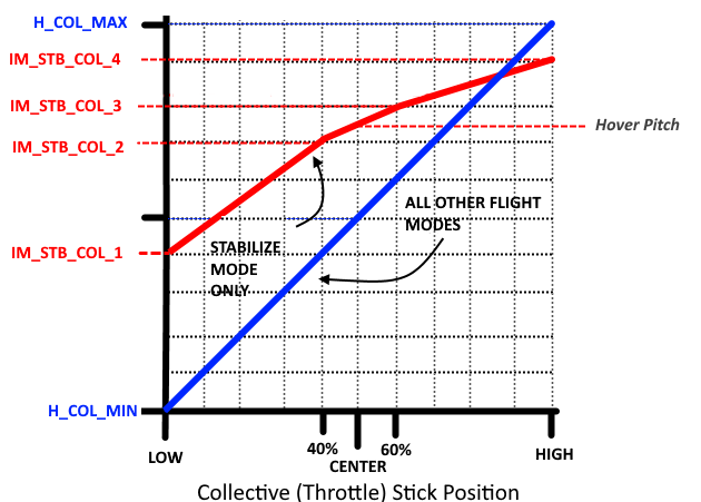 ArduPilot 为自稳模式(STABILIZE)提供了可编程总距曲线,可通过“柔化”曲线实现更平稳的飞行员控制。该曲线由 IM_STB_COL_x 系列参数设置(见下图),其他所有模式均使用上述设置的总距极值和直线曲线。