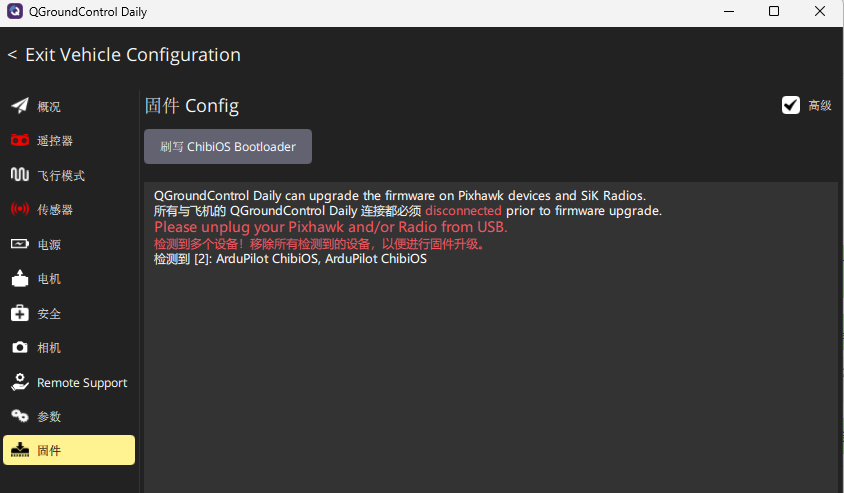 严禁操作:勾选“高级(Advanced)”后点击【刷写ChibiOS Bootloader】,此操作会擦除飞控Bootloader,目前需返厂才能重新烧录。