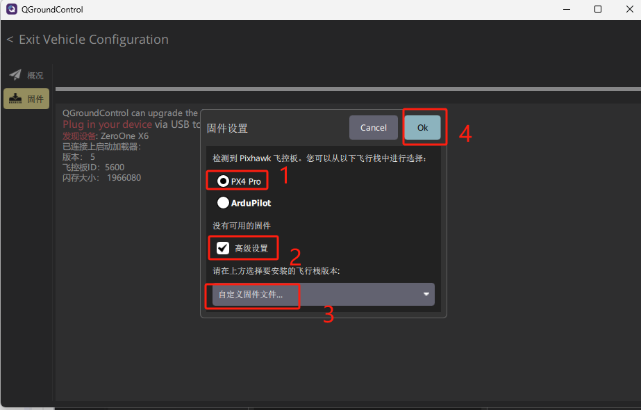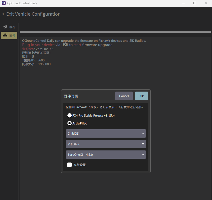 与在线安装一致:当飞控内置ArduPilot固件且已连接地面站时,进入固件安装界面后,右上角会出现“高级”勾选框。