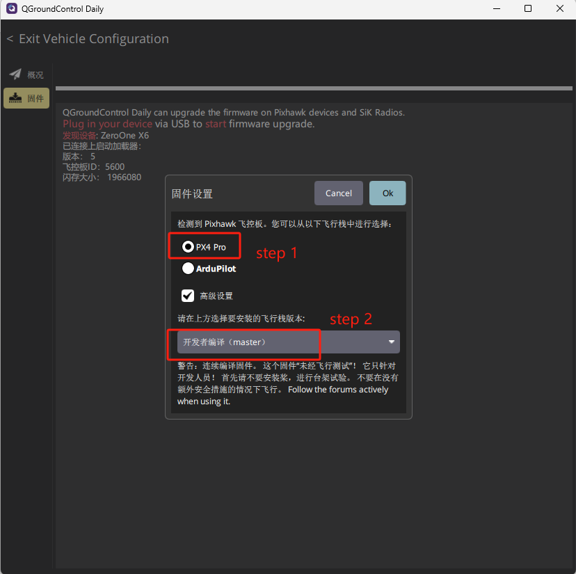 选择固件:在弹出的界面中,选择“安装PX4 PRO”,然后选择固件版本为【开发者编译(master)】,点击“OK”确认。