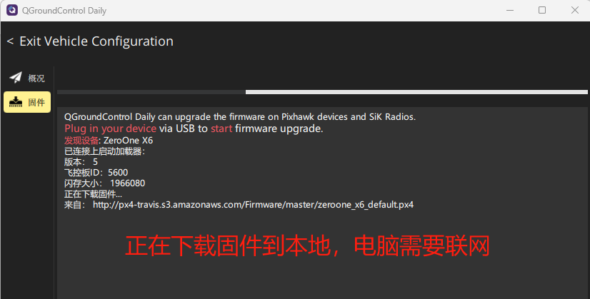 初始准备:飞控不连接电脑;打开QGC,进入“Vehicle Configuration(飞行器配置)”界面,点击进入刷固件界面,显示如下:
