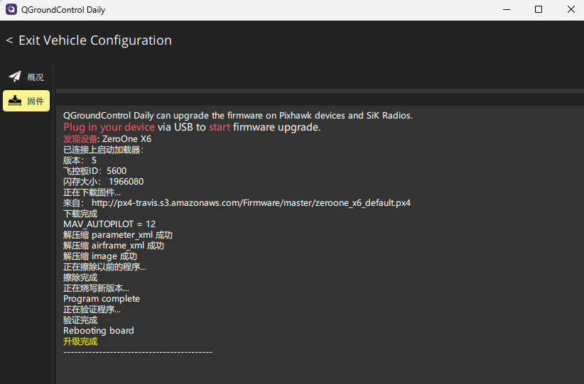 初始准备:飞控不接电源、不连接电脑;打开QGC,进入“Vehicle Configuration(飞行器配置)”界面,点击【固件】进入刷写界面,显示如下: