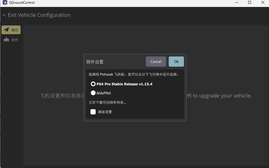 当飞控内置ArduPilot固件且已连接地面站时,进入固件安装界面后,右上角会出现“高级”勾选框。