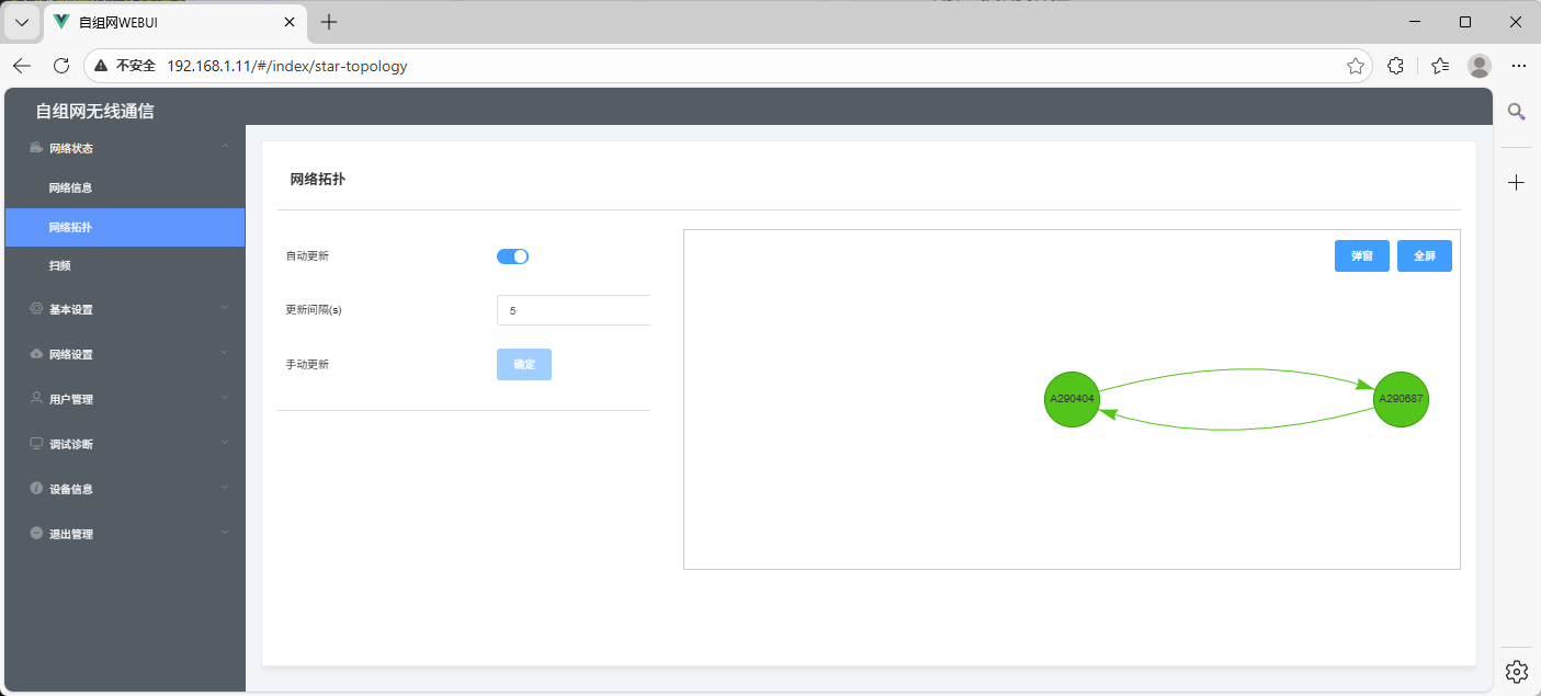 组网成功后,通过网络拓扑可以显示当前组网拓扑,默认自动刷新,支持手动设置刷新间隔.