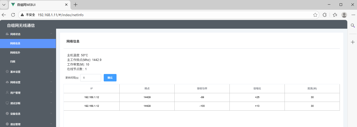 显示设备的组网核心信息,包含CPU温度、工作频点、工作带宽、在线节点数、邻节点数、自动更新链路信息的时间间隔